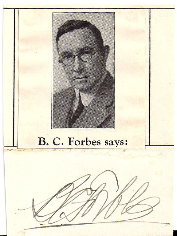 FORBES, Bertie Chas  (1880-1954).  Founder of Forbes Magazine. Uncommon signature “B.C. Forbes” on a slip. His printed portrait is affixed above...... $50.00