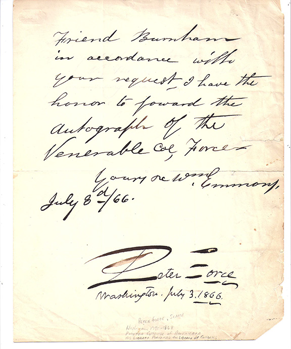 FORCE, Peter (1790-1868). American statesman, historian, government official and Mayor of Washington, D.C. (1936-1840). He sold his extensive library to the Library of Congress (1867). It was the largest private library relating to American history that have ever been assembled. In 1843, Force reprinted the W.J. Stone Declaration of Independence on rice paper. This is a very interesting response to an autograph request. Autograph letter signed, one page, Washington, July 3, 1866. He writes very boldly: “Friend Burnham in accordance with your request, I have the honor to forward the autograph of the venerable Col. Force. Yours, Peter Force”. Force’s letter is on the fourth leaf of a letter to him from July 4, 1866 discussing books. The signature and writing of Force is outstanding..........................$275.00