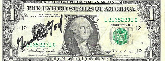 FORD, Gerald R. (1913-2006). 38th President of the United States (1974-1977). As Vice-President he acceded to the Presidency upon the resignation of Richard Nixon. This was a first in American history. President Ford pardoned former president Richard M. Nixon. U.S. One Dollar Federal Reserve Note, Series 1988 boldly signed “Gerald R. Ford” with excellent contrast.......................SOLD |