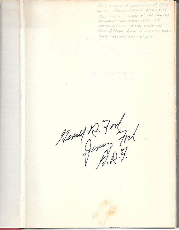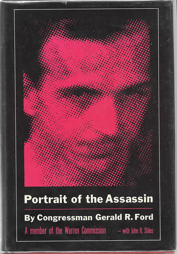 FORD, Gerald R. (1913-2006). Thirty-eighth president of the United States. His very desirable book: “Portrait of the Assassin.” Simon & Schuster, 1965, First printing, 510 pages, in V/G condition with fine dust jacket in plastic protective cover. Portrait of Oswald on the on the cover, bright colors. Slight erasure marks top of the front end paper where most likely a former ownership’s name was removed. Signed by Gerald Ford three times. Signed as “Gerald R. Ford,” “Jerry Ford” and “G.R.F.” This is Congressman Ford’s account of the assassination of President John F. Kennedy by Lee Harvey Oswald. Ford was a member of the Warren Commission that investigated the Kennedy assassination. This is Gerard Ford’s first book............$950.00