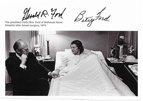 FORD, Gerald R. (1913-2006). Thirty-eight President of the United States. FORD, Betty (1918-2011). First Lady of the United States (1974-1977). Most unusual book photo on glossy paper of President Ford visiting Betty Ford while she is in a hospital bed recovering from breast surgery. This photograph was taken weeks after Gerald Ford became president. Overall measurement 4”x6”, B&W, very nicely hand signed by both. Signatures have excellent contrast. In fine condition........$95.00 ![]() |