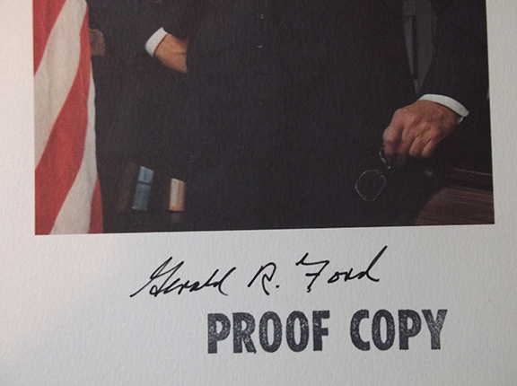 FORD, Gerald R. (1913-2006). 38th President of the United States (1974-1977). As Vice-President he acceded to the Presidency upon the resignation of Richard Nixon. This was a first in American history. This beautiful and colorful broadside measures 15”x22”, is limited to only 175 numbered copies. Each individually boldly hand signed by President Ford using a black ink pen. This broadside is printed on heavyweight Arches paper and illustrates a wonderful raised gold engraved Presidential Seal in the upper left corner. On the right hand side of the broadside is a striking formal three quarter length portrait of President Ford, in color. The heading of the text is in blue as well as the title of “Oath of Office” and “Remarks”. This broadside contains Ford’s Presidential “Oath of Office” and his “Remarks” made to Mr. Chief Justice, his dear friends and his fellow Americans. In Ford’s remarks he states “My fellow Americans, our long national nightmare is over. Our Constitution works; our great Republic is a Government of laws and not of men. Here the people rule⦔ This broadside is one of the most handsome Presidential collectible items to ever come on the market. It will most likely also be one of the rarest as of the 175 copies, it is said that President Ford kept half of the edition. Scarcer than the numbered edition, are the few Proof Copies that were made before the official printing. This is one of those “Proof Copies”. In near mint condition. The few of these broadsides that have come to the market to date have sold in the $2,000 range. Our price................................$875.00