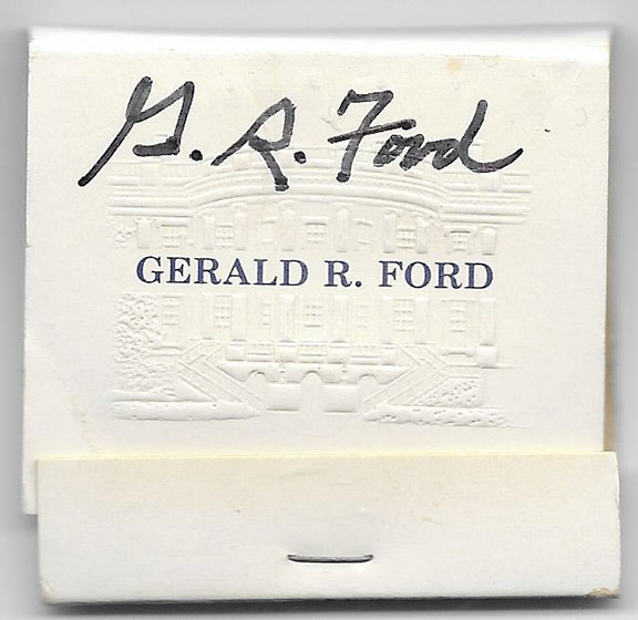 FORD, Gerald R. (1913-2006). Thirty-eighth president of the United States. Original “Official” book of presidential matches. Gerald R. Ford is print on the front cover over the embossed portrait of The White House. On the verso is a color seal of the President of the United States. Signed “G.R. Ford” top of the front cover. Matches appear unused, overall good condition ...........................$150.00![]() ![]() |