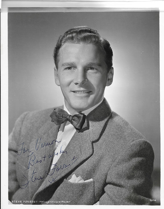 FORREST, Steve (1924-2013). American actor who played rugged manly roles Appeared in Last of the Mohicans TV movie (1977). Best known as Lt. Dan “Hondo” Harrison. On the TV series S.W.A.T. (1975-1976). Vintage MGM photograph, B&W, 8”x10”, half length pose smiling. Inscribed and signed: “For Vernon Best Wishes Steve Forrest.” Not common in signed photographs especially vintage ones. In fine condition.........$125.00![]() |