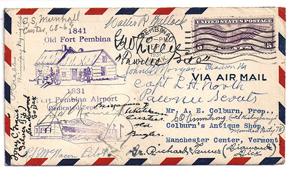 Signed near the bottom left part of the cover by Russell McNown, the pilot who flew this cover and one of the 50 pilots who attended this historic event. Also hand signing this cover are: G.W. Lillie, “Pawnee Bill” famous indian scout and circus owner, legendary frontiersman. Benjamin F. Whitehouse who adds “Custer Old Bugler.” He also organized the “Oklahoma Boomers” and led them in the land rush of 1889. He founded “Historic Wild West” tent show (1890) and was a partner with Buffalo Bill (1908-13). Capt. Luther H. North. Pawnee Scout and a Captain in the Civil War. C.O. Armstrong. He was with the Kislingbarry’s Mounted Party (1878). Dr. Richard Tanner. Famous western writer. Wonderful double signature also signing as “Diamond Dick“ C.S. Munhall. He adds “Custer (Cavalry) 69-69.” Walter R. Bullock. Pioneer Minnesota Airman who enrolled in the Curtiss Flying School (1916). He flew tests for his pilot’s license on 11/21/1916. John Morgan. He adds the word “Chadron.” Tom C. Grant. Adds “Silver Tip” “Deadwood, So.Dak.” J. Crabb. Adds “Winnipeg Flying Club V/P 1929.” And one other signature not identified. A most unique collectible and in fine condition................................... $650.00 ![]() |