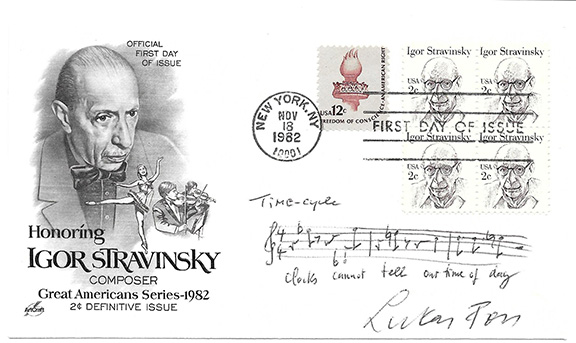 FOSS, Lucas (1922-2009). German American composer, conductor and pianist. An “All around Musician” “Time-cycle” received the New York Music Critic’s Circle Award for 1961. AMuQs, Foss writes three bars of music and the words to “Time-cycle” on a First Day Cover commemorating Igor Stravinsky. Excellent............................SOLD![]() |