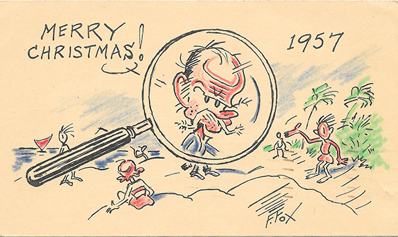 FOX, Fontaine (1884-1964). American cartoonist, his “Toonerville Folks” was a very popular cartoon strip that ran from 1908 to 1955. The Toonerville characters acted as spokesmen for Drano, Kellogg’s and Chef Boyardee. Original color drawings of people at the beach on a topical island with the main character enlarged by a magnifying glass. This was drawn on the back of a 2 cent postcard and sent to a collector in Connecticut as a Christmas greeting for 1957. Most unusual................$175.00