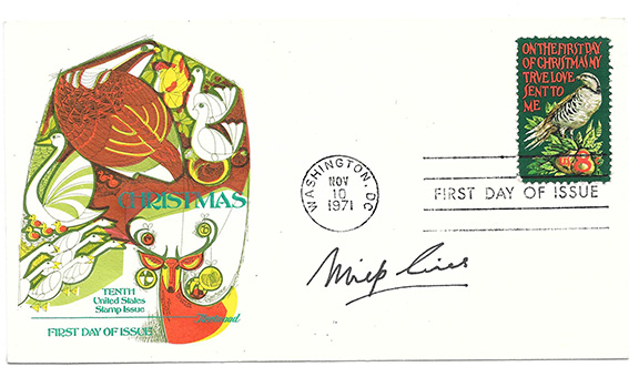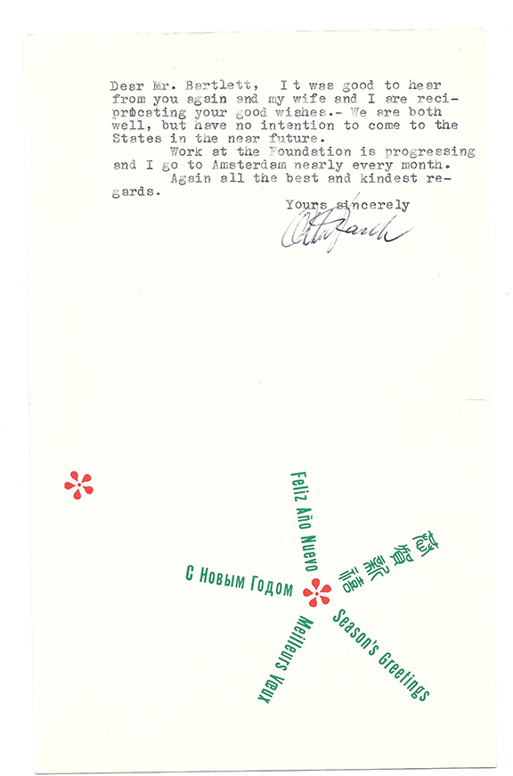 Otto Frank and Meip Gies GIES, Miep (1909-2010). Hid the Frank family in her Amsterdam home. Saved the diary written by Anne frank and gave it to Otto Frank many years later. The diary was the basis for the book “Diary of Anne frank” which remains one of the most moving testimonials to emerge from WWII. Holiday greeting card printed in five languages, no date but inside on the left blank panel is a typed letter signed by Otto Frank. “Dear Mr. Bartlette, It was good to hear from you again and my wife and I are reciprocating your good wishes. We have no intention to come to the States in the near future. Work at the foundation is progressing and I go to Amsterdam nearly every month. Again all the best and kindest regards. Yours sincerely, (signed) Otto Frank.” Together with a lovely colorful Christmas First Day Cover, Washington, DC, Nov. 10, 1971 hand signed by Miep Gies. Both items in fine condition and a wonderful combination of items for some creative framing.........SOLD ![]() |