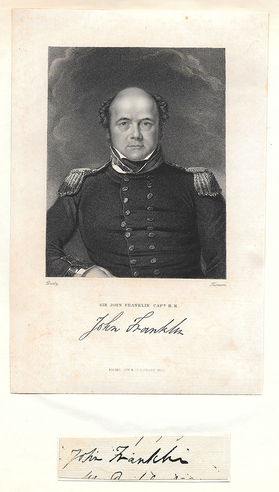 FRANKLIN, Sir John (1786-1847). British Royal Navy Officer and explorer of the Arctic. He participated in the French Revolutionary War and the Napoleonic War. He was Lt. Governor of Van Diemen’s Land now known as Tasmania (1837-1843). Franklin disappeared on his last expedition attempting to navigate the Northwest Passage in the Canadian Arctic. His icebound ships were abandoned and the entire crew perished from starvation even though some crew members resorted to cannibalism. In September 2014, the Prime Minister of Canada announced that the wreck of the HMS Erebus one of the two ships from Franklin’s voyage was discovered. In September 2016 Arctic Research Foundation found the wreck of the HMS Terror in pristine condition. Franklin is considered a hero who led his men in the quest for the Northwest Passage. A choice full signature “John Franklin” affixed to an album page along with a steel engraved portrait (Fisher Son & Co ,London, 1830). Perfect for framing.................SOLD