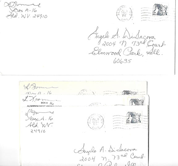 FROMME, Lynette “Squeaky Red.” (1948- ) Member of the Manson family during the late 60’s and early 70’s. She attempted to assassinate President Gerald R. Ford (1975) becoming the first woman in U.S. history to directly try to kill one of our presidents. She aimed a 45 caliber pistol at Ford on the grounds of the California State Capitol. A secret service agent grabbed the pistol before it could be fired. Fromme became a bizarre symbol of counter-culture terrorism at her 1975 arraignment and trial. Clad in bright red she was repeatedly ejected from the court room. She appeared with her head shaved. During her sentencing, she hit the prosecutor with an apple. She received a life sentence but was paroled in 2009 after 34 years. Collection of 13 envelopes, all sent from prison dated between 1892 and 1983. Each envelope bears her hand signed name (L. Fromme) and return address. She has also hand addressed each envelope. To seal the envelopes, they have a glue back flap that was most likely licked therefore contains her DNA. Each envelope bears a 20 cent US postage stamp that most likely contains her DNA as well. Of the many dozens of letters from Lynette Fromme we have handled through the years we have never found on signed with her last name. It appears that to get one of her signatures it would have to come from an envelope she mailed. The collection in V/G-Fine condition.......................$1095.00