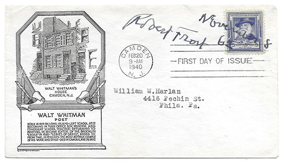 FROST, Robert (1874-1963). Popular American poet. Honored to read a poem at President Kennedy’s inaugural. Awarded four Pulitzer Prizes (1924), (1931), (1937) and (1943). First Day Cover commemorating Walt Whitman. Attractive cachet of Walt Whitman’s home and a short biography. U.S. 5 cent Walt Whitman postage stamp cancelled First Day of Issue, Camden, NJ Feb 20 1940. Hand signed by Frost: “Robert Frost November 8, 62.” In very good condition and rather uncommon in this format.................$350.00