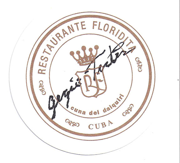 Original drink coaster from the Floridita, Havana, Cuba where Hemingway and Fuentes spent much of their time drinking. There stools at the end of the bar are still on display. The Floridita is the bar where the daiquiri was invented. The coaster is boldly hand signed by Gregorio Fuentes. Together with an original photo of Fuentes in his living room signing the coaster..................................$95.00