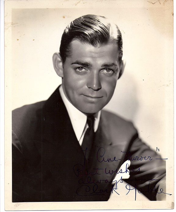 Gable, Clark (1901-1960). Handsome American film actor known as “The King of Hollywood”. Best remembered as “Rhett” in Gone With The Wind. Outstanding vintage MGM photograph of Gable, head and shoulders pose of the very young looking actor. He is looking directly into the camera sporting a slight smile. Inscribed: “To Cine Miroir, best wishes always, Clark Gable”. Possibly the earliest signed photo of Gable that we have had the pleasure of handling. Cine Miroir began publishing in May 1922 ending in 1953. In very nice condition............... $1,250.00