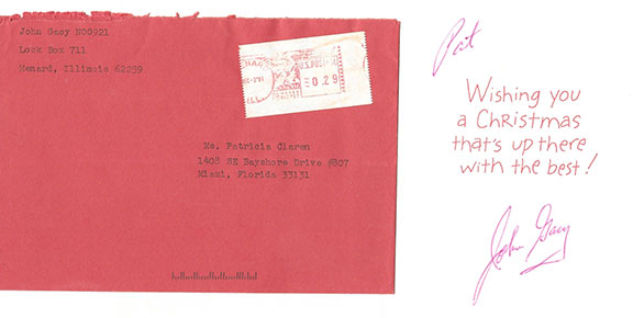 GACY, John Wayne #48. (1942-May 10, 1994). American serial killer who is also known as the “Killer Clown”. He was convicted of sexual assault and murder of at least 33 teenage boys and young men. The killings took place between 1972 and 1978 in the Chicago area. Twenty-six of Gacy’s victims were buried in a crawl space under his home. Three others were buried on his property and the last four were dumped in the Des Plains River. Gacy was convicted of the 33 murders and sentenced to death for 12 of them. He spent 14 years on death row before being executed by lethal injection. His scarce Christmas card for the year 1991. On the cover is Santa Claus pulling himself up a mountain followed by three reindeer. Inside panel Gacy using a red ink pen writes: “Pat John Gacy.” Obviously, in the holiday spirit he has signed his name with an unusual large signature. This card shows the human side of a serial killer. Together with the original envelope. Most unusual, In fine condition................$450.00
