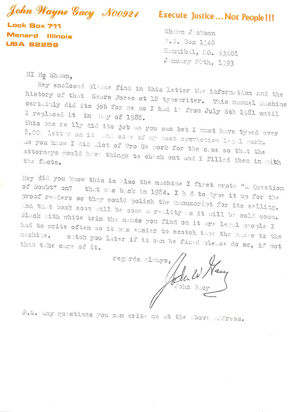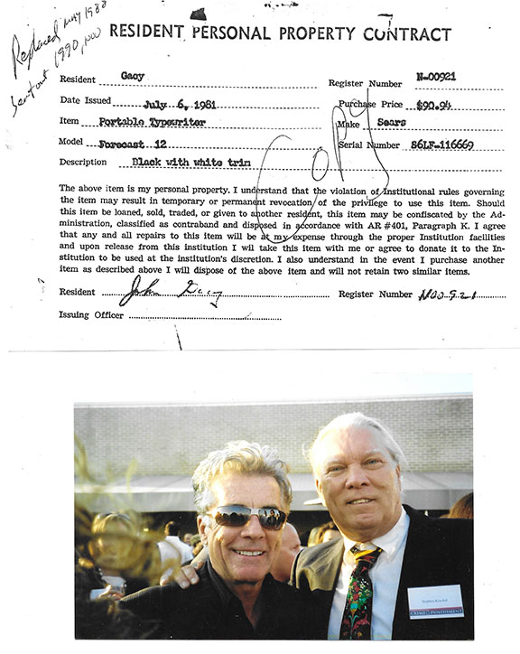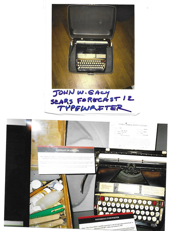 GACY, John Wayne. (1942-1994). Convicted for the rape and murder of 33 boys between 1972 and 1978. Twenty-seven of his victims were buried in a crawl space under the floor of his home. Best known as “The Killer Clown.” His registered clown costumes are “Patches” and “Pogo.” He is also known for his statement saying he was only guilty of running a cemetery without a license. His execution was without question a media sensation. Papers regarding the sale of Gacy’s famous typewriter. Letter to a collector describing how important the typewriter was for him. He typed his legal work on this typewriter and wrote his book “A Question of Doubt.” Included is a copy of his Contract of residential Personal Property describing the typewriter. Also included is an original Poloroid camera color photograph where on the margin Gacy has signed his name and added: “John W. Gacy Sears Forecast 12 Typewriter.” We purchased this typewriter and sold it to the Crime and Punishment Museum in Washington, D.C. Included is a color photograph of this typewriter on display in the museum. Last item is a color photograph of Steve Koschal and John Walsh after walking the Red Carpet during the opening of the museum. |