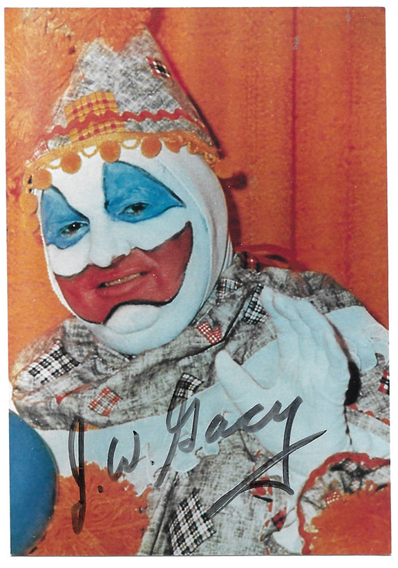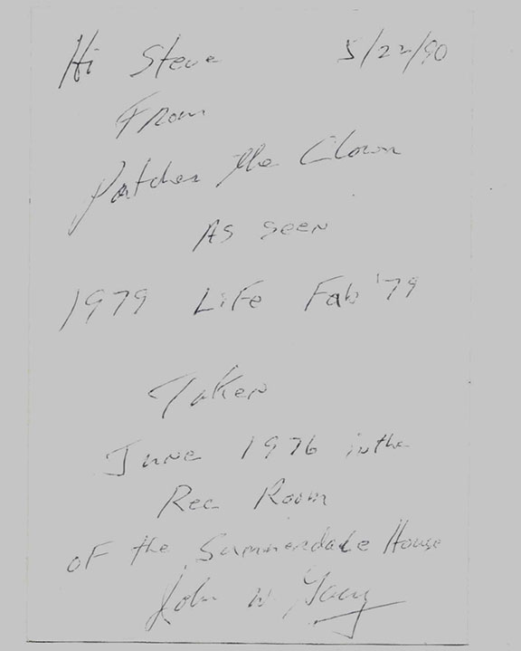 GACY, John Wayne (1942-May 10, 1994). American serial killer who is also known as the “Killer Clown.” He was convicted of sexual assault and murder of at least 33 teenage boys and young men. The killings took place between 1972 and 1978, in the Chicago area. Twenty-six of Gacy’s victims were buried in a crawl space under his home. Three others were buried on his property and the last four were dumped in the Des Plains River. Gacy was convicted of the 33 murders and sentenced to death for 12 of them. He spent 14 years on death row before being executed by lethal injection. Color photograph of Patches the Clown. Half length pose, smiling. Measures 3.5”x5”. Very boldly signed on the front. On the verso Gacy has written, in ink, “5/22/90, Hi Steve, From Patches the Clown as seen 1979 Life Feb 79 taken June 1976 in the Rec room of the Summerdale House, John Wayne Gacy.” Excellent content mentioning the Summerdale House, Very few of the photographs were signed on the front making this photograph, extra desirable. In very fine condition. These Photographs with writing on the verso are becoming rather uncommon. Illustraion of verso shown here appears to be light. Not so on original, writing on original is fine and normal............................$1875.00