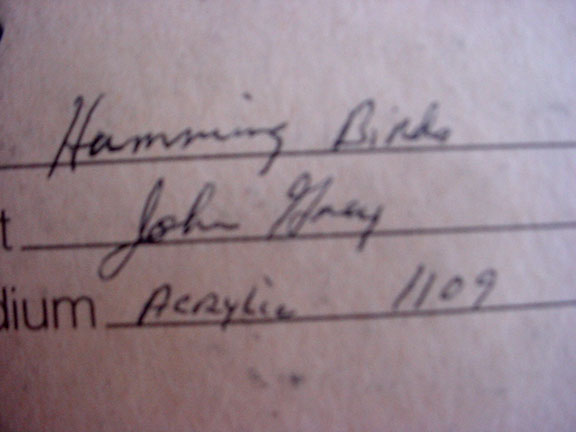 Original painting of three Hummingbird‘s in flight. Large size, very colorful painting, measures 14 in. by 18 in., signed in red ink bottom right with the desirable full signature of John W. Gacy (not the usual J.W. Gacy).. On the verso Gacy has written the title of the painting and signed his name in full once again "John W. Gacy." He has added the number of the painting as "Acrylic 1109" and signed his name, a third time, this time as “John Gacy”. Wrapped in the original plastic (worn) as originally sent from prison, with prison label. Painting in very good In fine condition..............SOLD
