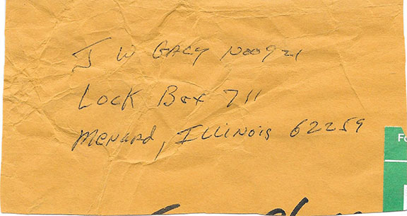 GACY, John Wayne (1942-1994). Convicted and executed mass murderer. The most savage, cruel, inhumane killer of 33 young boys and likely more. Professional clown created “Patches” and “Pogo the Clown”. His signature, prison number and return address on part of a manila envelope that was used to send paintings from prison. Light wrinkling otherwise very good condition..................................SOLD