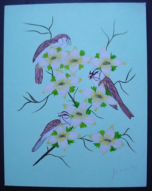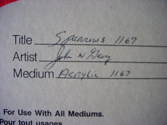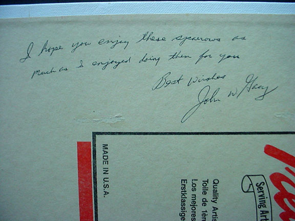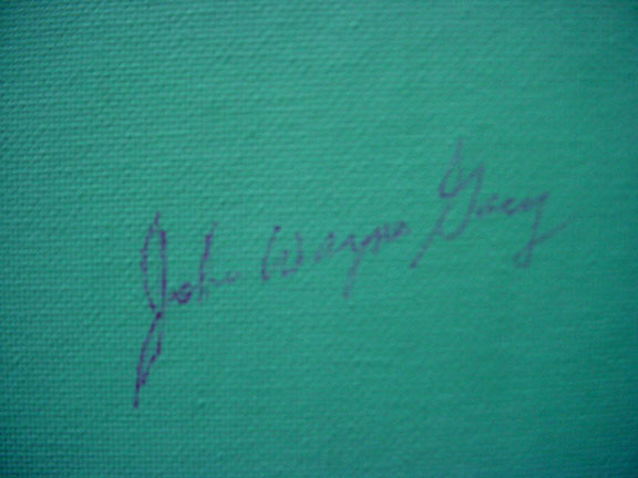 Signed Original Oil Painting With Gacy’s Scarce Full Signature Original painting of three Sparrow’s sitting on branches of a flowering tree. Large size, very colorful painting, measures 14 in. by 18 in., signed in red ink bottom right with the scarce full signature of “John Wayne Gacy” (not the usual J.W. Gacy). On the verso Gacy has written the title of the painting and signed his name once again as "John W. Gacy." He has added the number of the painting as "Acrylic 1167" and signed his name, a third time, and again as “John W. Gacy”. Painting in very good In fine condition. Would look fabulous in the frame of your choice..............SOLD ![]() ![]() ![]() |