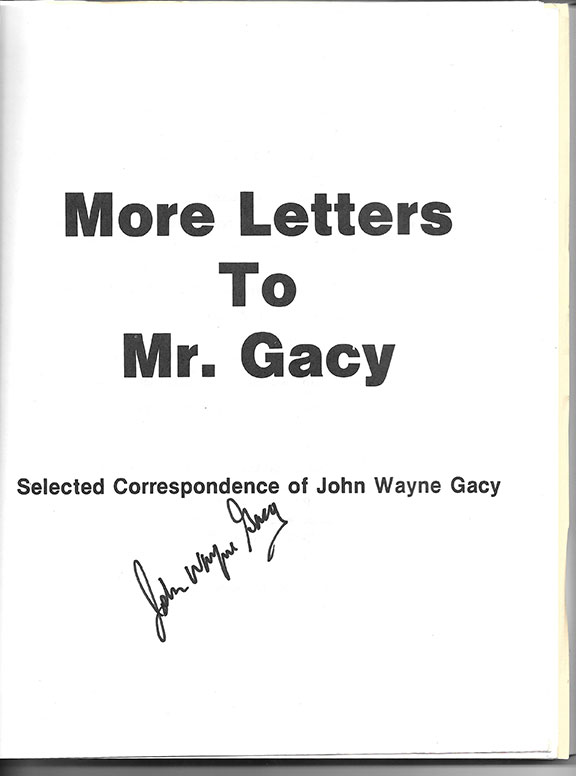 GACY, John W. (1942-1994) Convicted and executed mass murderer. The most savage, cruel and inhumane killer of 33 young boys and possibly more. Professional clown who patented “Pogo” and “Patches.” During 1962, while in prison Gacy turned to painting. His artwork was instantly popular and is still collected worldwide. Some of his paintings have sold as high as 475,000. Gacy was executed by legal injection on May 10, 1994. His book: “More Letters To Mr. Gacy, Selected Correspondence of John Wayne Gacy.” Myco Associates, November 1992,First printing, so stated. Soft cover measures 8.5”x11”. Very interesting reading, letters to Gacy from all the Major News Stations, Brian Denney (actor who played Gacy), Life Magazine, ABC, Fox, The Oprah Show and dozens more. Most letters to Gacy also illustrate his response. A fascinating read. Signed ion the title page with a full, ink signature. Only a handful of these were signed.................................SOLD