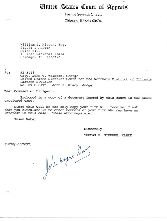 Cover letter United States Court of Appeals, Chicago, IL to John Wayne Gacy’s attorney for the case John W. Gacy v. George Welborn. John F. Grady, Judge. The court clerk is sending a copy of a document issued by the court in the above mentioned case. Hand signed in full “John Wayne Gacy.” This is Gacy’s copy, which he hand signed with his desirable full signature to indicate ownership. This was his usual habit to sign most everything in his personal files. Two file holes in the left margin otherwise in good condition....................SOLD