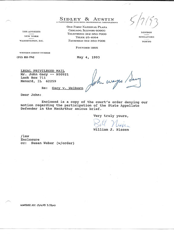 Original letter from Gacy’s attorney Sidley & Austin, Chicago. IL. Dated in another hand 5/4/93. Re: Gacy v. Welborn. “Dear John, Enclosed is a copy of the court’s order denying our motion regarding the participation of the State Appellate Defender in the MacArthur amius brief...” Hand signed in blue ink by the attorney. Signed by Gacy with his desirable full signature “John Wayne Gacy” with his desirable full signature to indicate ownership. Usual file holes in the left margin....................SOLD