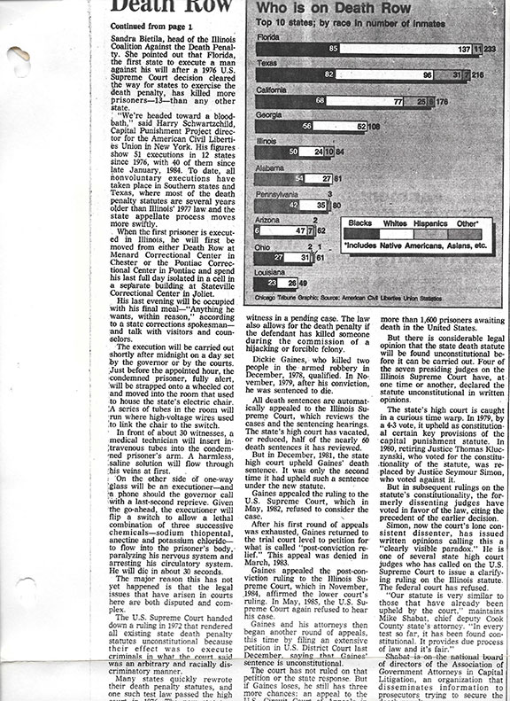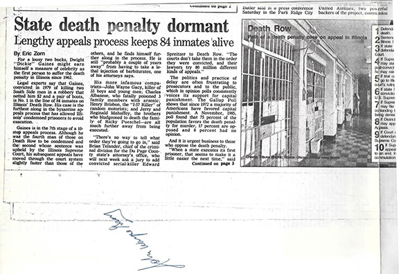 Copy of a two page newspaper article “State death penalty dormant.” which mentions John Wayne Gacy, Legal size, folded. Hand signed in ink with a desirable full signature “John Wayne Gacy” in a clear area. Gacy collected and filed most every newspaper article he could find which mentioned his name. Two file hole left margin otherwise in fine condition...................$145.00