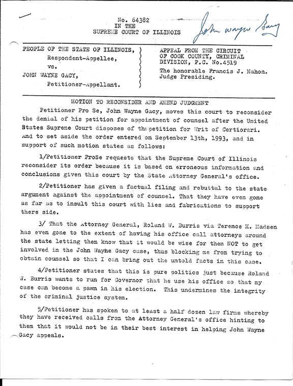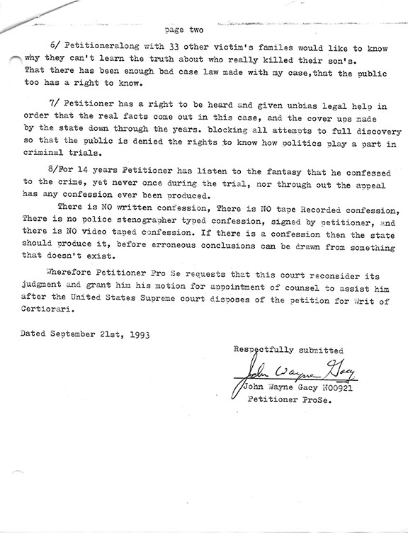 From the Personal/Private Files of John Wayne Gacy Fabulous retained copy of John Wayne Gacy’s Petition to the Supreme Court of Illinois in the case of People of the State of Illinois v. John Wayne Gacy Dated September 21, 1993. Gacy accuses Attorney General Roland W. Burris who want to run for Governor that he has gone to the extent of having his office call attorneys around the state letting them know it would be wise for them NOT to get involved in the John Wayne Gacy case, thus blocking me from trying to obtain counsel....” Gacy also states that “he along with 33 other victim’s families would like to know why they can’t learn the truth about who really killed their son’s. That there has been enough bad case law made with my case, that the public too has a right to know.” Gacy continues: “For 14 years petitioner has listen to the fantasy that he confessed to the crime, yet never once during the trial, nor throughout the appeal has any confession ever been produced....” A remarkable legal document, Gacy’s retained copy. File holes left margin. Hand Signed “John Wayne Gacy” at the top of page one...................$350.00 ![]() |
