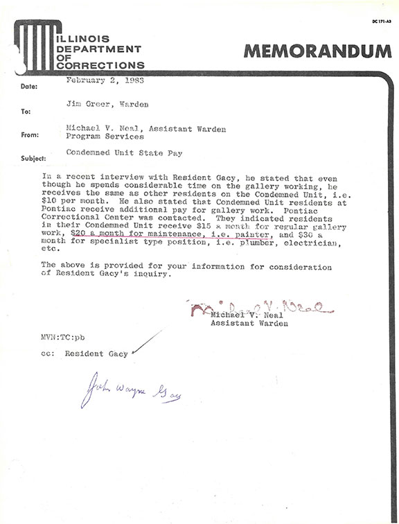 GACY, John Wayne #19. (1942-May 10, 1994). American serial killer who is also known as the “Killer Clown”. He was convicted of sexual assault and murder of at least 33 teenage boys and young men. The killings took place between 1972 and 1978 in the Chicago area. Twenty-six of Gacy’s victims were buried in a crawl space under his home. Three others were buried on his property and the last four were dumped in the Des Plains River. Gacy was convicted of the 33 murders and sentenced to death for 12 of them. He spent 14 years on death row before being executed by lethal injection. Actual page from Gacy’s personal files, kept in his cell that he signed just a day or two before his execution. He is also known for his statement of saying he was only guilty of running a cemetery without a license. His execution was without question a media sensation. Document, Memorandum, Illinois Department of Corrections, February 2, 1983, from Assistant Warden to the Warden regarding Condemned Unit State Pay. Gacy is asking for an increase in monthly pay and refers to how much residents are being paid to another correctional center. Gacy’s copy with the usual two file holes signed in full by John Wayne Gacy. In V/G. condition..................$185.00