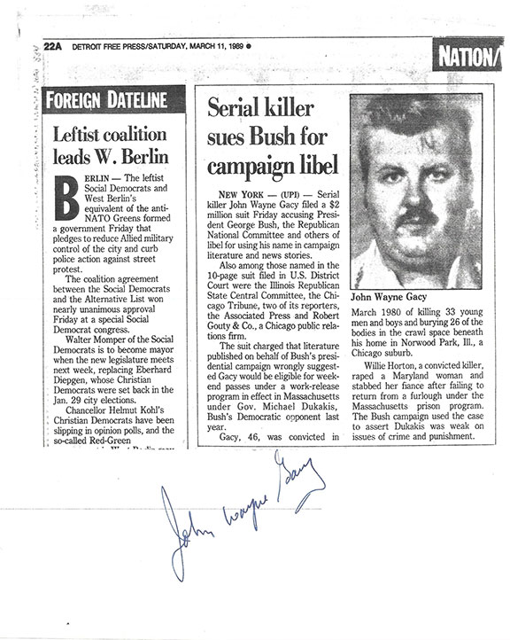 GACY, John Wayne #24. (1942-May 10, 1994). American serial killer who is also known as the “Killer Clown”. He was convicted of sexual assault and murder of at least 33 teenage boys and young men. The killings took place between 1972 and 1978 in the Chicago area. Twenty-six of Gacy’s victims were buried in a crawl space under his home. Three others were buried on his property and the last four were dumped in the Des Plains River. Gacy was convicted of the 33 murders and sentenced to death for 12 of them. He spent 14 years on death row before being executed by lethal injection. Actual page from Gacy’s personal files, kept in his cell that he signed just a day or two before his execution. He is also known for his statement of saying he was only guilty of running a cemetery without a license. His execution was without question a media sensation. Copy of a newspaper article, Detroit Free Press, March 11, 1989, regarding Gacy filing a two-million-dollar lawsuit against President George Bush and others for libel. Signed in full. Usual two file holes otherwise in fine condition..................SOLD