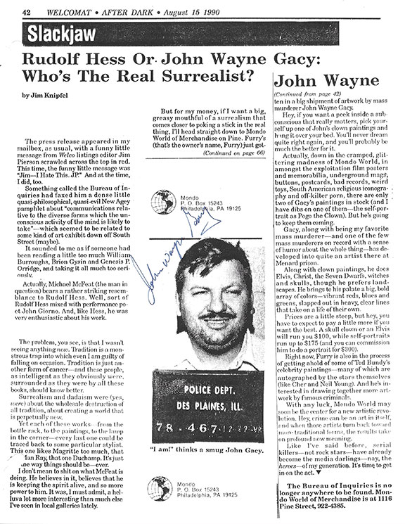 GACY, John Wayne #26. (1942-May 10, 1994). American serial killer who is also known as the “Killer Clown”. He was convicted of sexual assault and murder of at least 33 teenage boys and young men. The killings took place between 1972 and 1978 in the Chicago area. Twenty-six of Gacy’s victims were buried in a crawl space under his home. Three others were buried on his property and the last four were dumped in the Des Plains River. Gacy was convicted of the 33 murders and sentenced to death for 12 of them. He spent 14 years on death row before being executed by lethal injection. Actual page from Gacy’s personal files, kept in his cell that he signed just a day or two before his execution. He is also known for his statement of saying he was only guilty of running a cemetery without a license. His execution was without question a media sensation. Copy from a magazine of a story about Rudolf Hess or John Wayne Gacy, Who’s the Real Surrealist? A nice favorable report of a gallery handling Gacy’s artwork. Signed in full by Gacy next to his police mug shot. Interesting story regarding a new artistic revolution. Usual two file holes otherwise in fine condition..................SOLD
