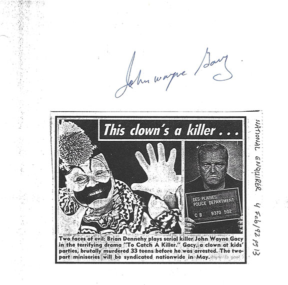 GACY, John Wayne #28. (1942-May 10, 1994). American serial killer who is also known as the “Killer Clown”. He was convicted of sexual assault and murder of at least 33 teenage boys and young men. The killings took place between 1972 and 1978 in the Chicago area. Twenty-six of Gacy’s victims were buried in a crawl space under his home. Three others were buried on his property and the last four were dumped in the Des Plains River. Gacy was convicted of the 33 murders and sentenced to death for 12 of them. He spent 14 years on death row before being executed by lethal injection. Actual page from Gacy’s personal files, kept in his cell that he signed just a day or two before his execution. He is also known for his statement of saying he was only guilty of running a cemetery without a license. His execution was without question a media sensation. Copy of a newspaper article “This clown’s a killer.” Portrait of Gacy as a clown and alongside a portrait of Brian Dennehy posing as Gacy in a police mug shot. Signed in full by John Wayne Gacy, usual file holes otherwise in fine condition. From The National Enquirer 4 Feb. 1992..................SOLD