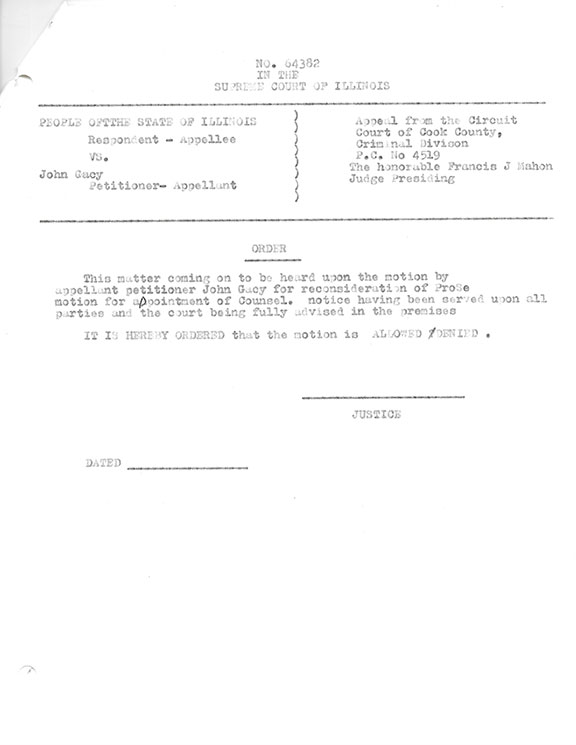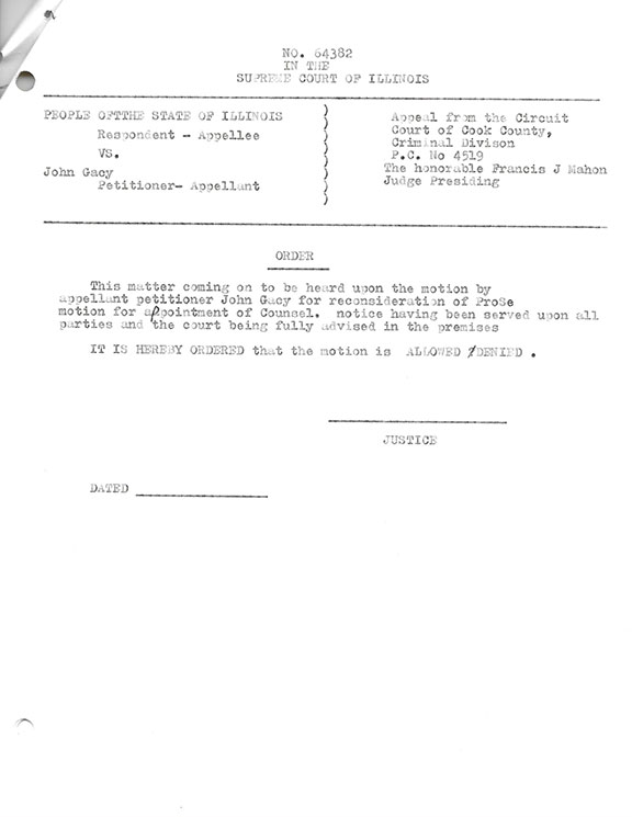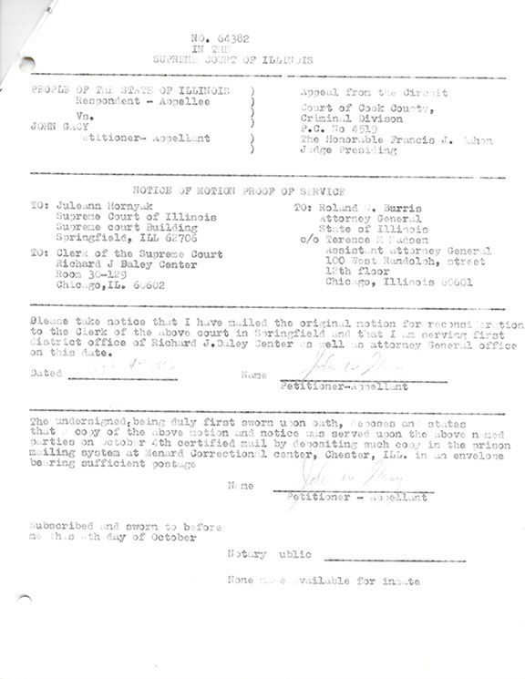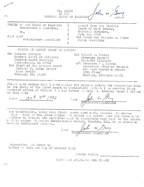 GACY, John Wayne #33. (1942-May 10, 1994). American serial killer who is also known as the “Killer Clown”. He was convicted of sexual assault and murder of at least 33 teenage boys and young men. The killings took place between 1972 and 1978 in the Chicago area. Twenty-six of Gacy’s victims were buried in a crawl space under his home. Three others were buried on his property and the last four were dumped in the Des Plains River. Gacy was convicted of the 33 murders and sentenced to death for 12 of them. He spent 14 years on death row before being executed by lethal injection. Actual page from Gacy’s personal files, kept in his cell that he signed just a day or two before his execution. He is also known for his statement of saying he was only guilty of running a cemetery without a license. His execution was without question a media sensation. Gacy’s copy of People of the State of Illinois vs John Gacy. 4 oct. 1993. Four pages of Proof of Service bearing 4 copies of Gacy’s signature. Hand signed “John W. Gacy” at the top of page one. Usual file holes otherwise in fine condition..................$155.00