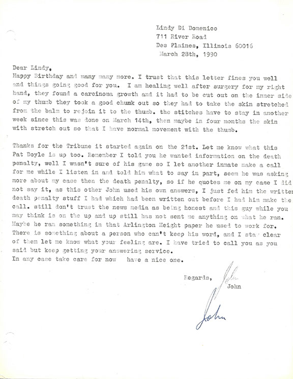 GACY, John Wayne #39. (1942-May 10, 1994). American serial killer who is also known as the “Killer Clown”. He was convicted of sexual assault and murder of at least 33 teenage boys and young men. The killings took place between 1972 and 1978 in the Chicago area. Twenty-six of Gacy’s victims were buried in a crawl space under his home. Three others were buried on his property and the last four were dumped in the Des Plains River. Gacy was convicted of the 33 murders and sentenced to death for 12 of them. He spent 14 years on death row before being executed by lethal injection. Actual page from Gacy’s personal files, kept in his cell that he signed just a day or two before his execution. He is also known for his statement of saying he was only guilty of running a cemetery without a license. His execution was without question a media sensation. Retained copy of a letter from Gacy, dated March 28, 1990. Talks in depth about his recent surgery on his hand. Goes into detail about someone he distrusts and the game he plays with them. Hand signed “John” just below his carbon signature. Usual file holes otherwise in fine condition..................SOLD