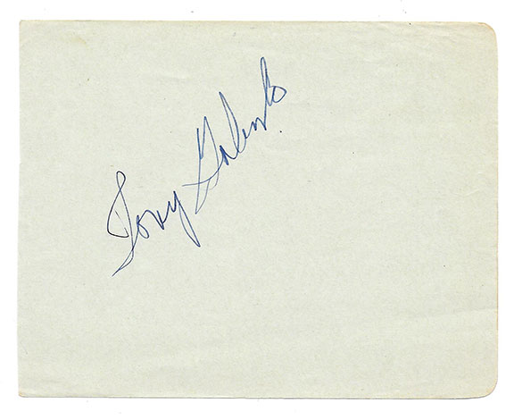 GALENTO, Tony (1910-1979). American Heavyweight Boxer nicknamed “Two Ton Tony.” One of the most colorful fighters in the history of boxing. He once knocked out Joe Louis. After his retirement, in a Newark, New Jersey club he knocked out cold Jackie Gleason. Choice signature on a vintage album page..........................$47.50 |