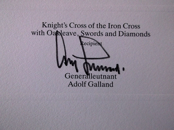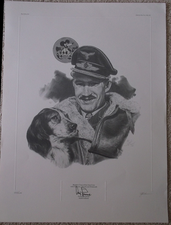 GALLAND, Adolf (1912-1996). German Luftwaffe General, fighter pilot, Ace credited with 104 victories. Earned the Knight’s Cross of the Iron Cross with Oak Leaves, Swords and Diamond. He had many disagreements with Goring and that relationship deteriorated. Galland was put under house arrest. He was one of the most popular of all German fighter pilots. Wonderful lithograph by artist Janet Keck, published by the King’s Crown Gallery in 1989. Limited to 500 numbered and signed copies by both Janet Keck and Adolf Galland. Galland is head and shoulders in his flight jacket and hat wearing his Knight’s Cross and holding his famous dog. His nose art of a “Mickey Mouse” style is also illustrated. Measures appx: 19”x25”. After the printing of these lithographs, the printing plates were destroyed. As new condition. We have three of these lithographs, number 498, 499 and 500. Each......$165.00