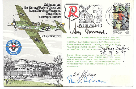 Leading WWII Aces Hartmann, Eric (1922-1993) German fighter pilot, world’s top Ace credited with 352 victories. Sakai, Saburo (1916-2000). Japanese naval aviator and Ace, His autobiography claims 64 aerial victories. Fourth top scoring pilot of the Japanese Navy/Air Force. Colorful RAF cover, postmarked 12/7/1975 with a cachet of a Messerschmitt 109 in flight. Boldly signed by Adolf Galland, Eric Hartmann and a choice double signature of Saburo Sakai in English and again in Japanese. Also signed by a commemorative flight pilot. A very rare combination of important signatures of WWII Aces. Fine condition...........................SOLD ![]() |
