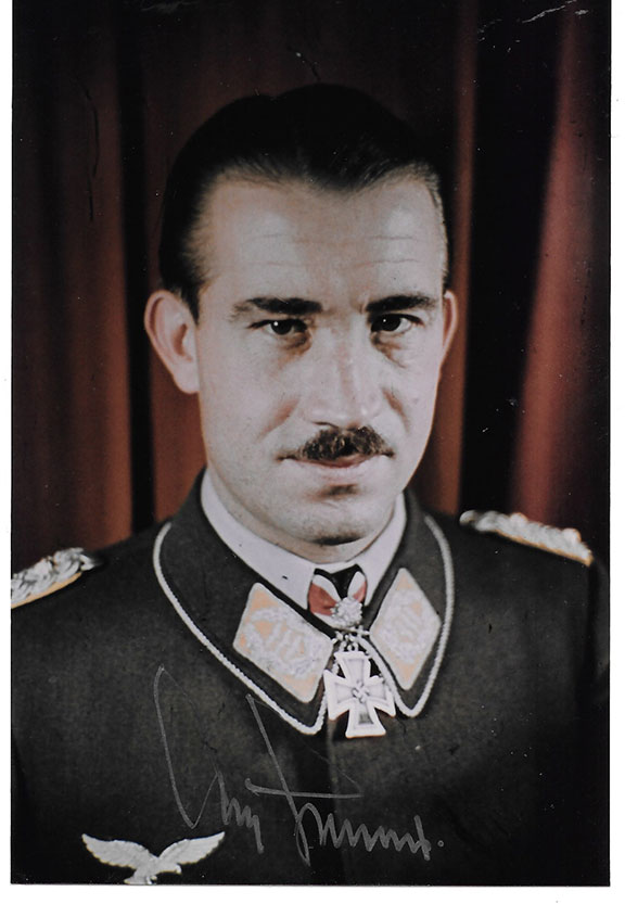 GALLAND, Adolf (1912-1996). German fighter pilot, General of the fighters. Ace credited with 104 victories in the West and a Jet Ace with 7 victories. Captured in 1945 and sent to England for debriefing. Fabulous color photograph, 4”x6” head and shoulders pose in uniform. Boldly signed using silver ink. Signed once again on verso. As nice as a signed photograph can get.......................... $145.00 |