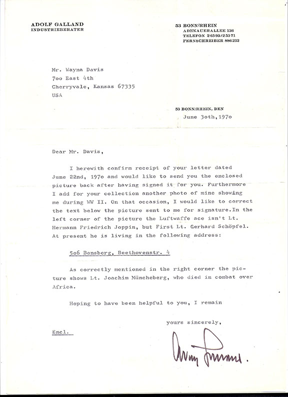 GALLAND, Adolf (1912-1996). German Luftwaffe General, Flying Ace who flew 705 combat missions and had 104 victories. On four occasions he survived being shot down. Chosen to Command Germany’s Fighter Force. In 1942 he was awarded Diamond’s to his Iron Cross with Oak Leaves and Swords. Typed letter signed, one full page on his name/address imprinted letterhead. June 30, 1970. Galland writes in part: “.....furthermore I add for your collection another photo of mine showing me during WWII. On that occasion, I would like to correct the text below the picture sent to me for signature. In the left corner of the picture the Luftwaffe Ace isn’t Lt. Hermann Friedrich Joppin, but First Lt. Gerhard Schopfel. A present he is living in the following address...” Galland continues: “...as correctly mentioned in the right corner the picture shows Lt. Joachim Muncheberg, who died in combat over Africa...” Very boldly signed with a full signature of Adolf Galland......................... $125.00