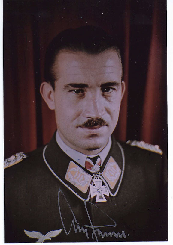 GALLAND, Adolf (1912-1996). German Luftwaffe General, Flying Ace who flew 705 combat missions and had 104 victories. On four occasions he survived being shot down. Chosen to Command Germany’s Fighter Force. In 1942 he was awarded Diamond’s to his Iron Cross with Oak Leaves and Swords. Color photograph, 4”x6”, head and shoulders pose in uniform. Signed in silver ink. Excellent contrast......................... SOLD |
