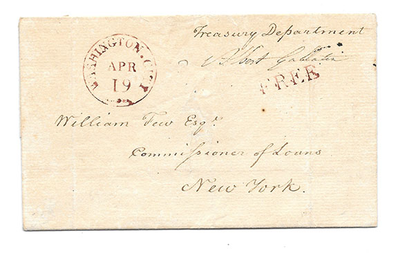 GALLATIN, Albert (1761-1849). Swiss -American politician. Important leader of the Democratic-Republican Party. He represented Pennsylvania in the House of Representatives and the Senate. He became the longest tenured United States Secretary of the Treasury serving under Thomas Jefferson and James Madison. He studied the languages of the Native Americans and is called “The Father of American Ethnolgy.” Excellent cover bearing a Free franking signature of Albert Gallatin as Secretary of the Treasury. Made out to William Few, Esq. Commissioner of Loans, New York. Clear postmark “Washington, Apr.19.” Stamped in red ink “Free.”................$195.00