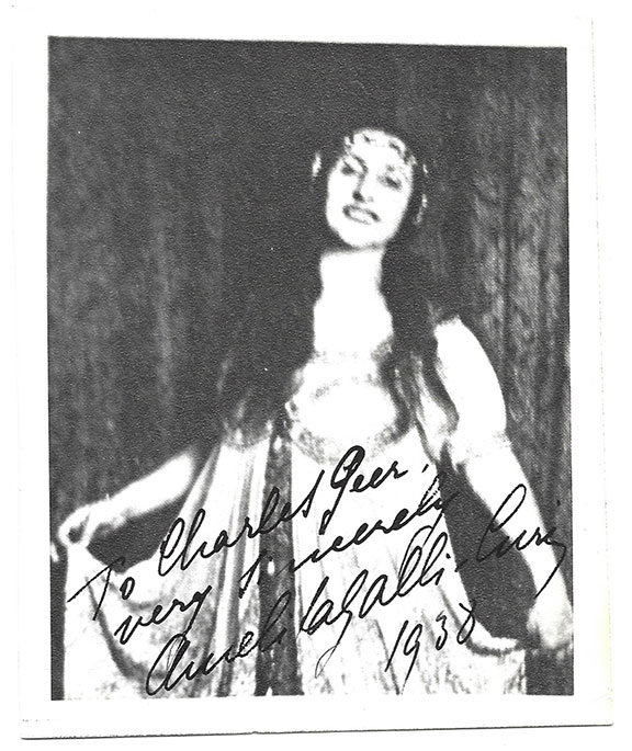 GALLI-CURCI, Amelia (1882-1963). Italian soprano. One of opera’s most famous coloratura singers. She had a sensational debut as Lucia in Lucia di Lammermoor in 1916. She had 20 curtain calls. She took Enrico Caruso’s place on gala opening nights until the 1929-30 season. Photograph, B&W, half-length pose, 4”x5” inscribed and signed: To Charles Geer, very sincerely Amelia Galli-Curci.” In very good condition................$157.50 |