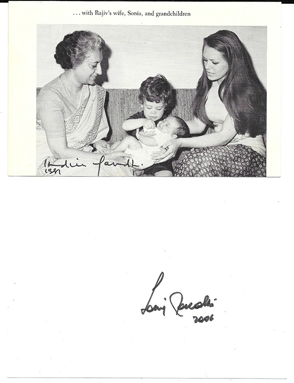 Magazine portrait of Indira Gandhi with Sonia Gandhi and grandchildren. Black & White and measures appx. 4”x6”. Signed “Indira Gandhi” and dated “1981” (as Prime Minister) in her hand.