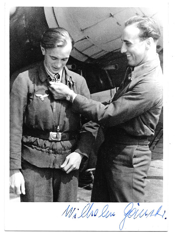 GANZLER, Wilhelm (1919-1985). Highly decorated aerial gunner for Schnaufer, the world’s highest scoring night fighter Ace. Ganzler participated in 115 missions as an aerial gunner. Photograph, B&W, 4”x6” of Ganzler in flight gear receiving his RK from Schnaufer. Boldly signed by Wilhelm Ganzler on the lower white margin. Excellent condition............SOLD |