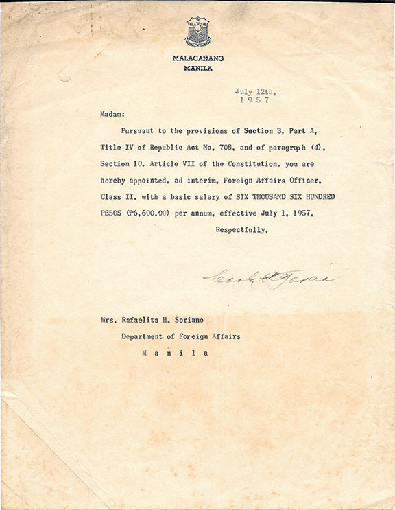 GARCIA, Carlos (1896-1971). Vice President of the Philippines (1953-1957), President of the Philippines (March 1957- 1961). Teacher, poet and lawyer. During WWII he refused to cooperate with Japan and he refused to surrender. His name was placed on the wanted list with a price on his head. Document signed as President on the letterhead of Malacanang, Manila. Dated July 12, 1957 to Mrs. Soriano, Department of Foreign Affairs. Garcia writes that according to their Republic act and Article VII of the Constitution, she is appointed, ad interim, Foreign Affairs officer, Class II with a salary of 6 thousand six hundred Pesos per year. Light toning otherwise V/G...............$95.00