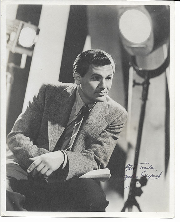 GARFIELD, John (1913-1952). Oscar nominated actor. Appeared in The Postman Always Rings Twice and gentleman’s Agreement, Garfield was blacklisted in Hollywood for his liberal beliefs. Died at the age of 39. Vintage photograph, 8”x10”, B&W, half length pose inside a studio. Signed with a two word sentiment in fountain pen: “Best wishes John Garfield.” In VG/Fine condition.........$325.00![]() |