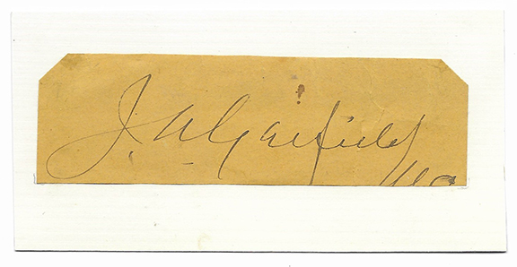 GARFIELD, James A. (1831–1881) The 20th President of the United States, serving from March 4, 1881, until his assassination later that year. A lawyer and Civil War military officer, Garfield had served nine terms in the House of Representatives; he is the only sitting member of the House to be elected president. Assassinated at the early age of fifty years old. Fine signature “J.A. Garfield” with a partial “MC” in his hand. A free franking signature as a Member of Congress, cut from an envelope.................$450.00