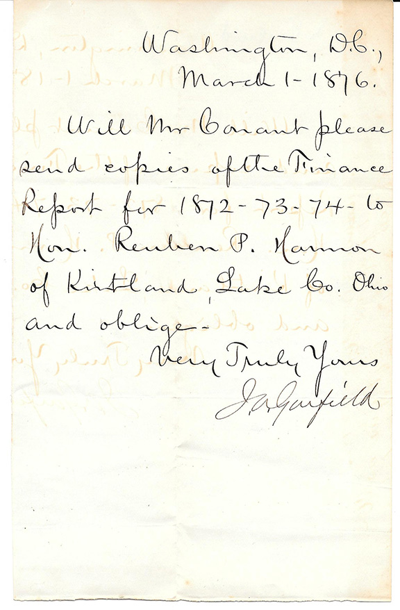 GARFIELD, James A. (1831-1881). 20th President of the United States. Second President of the U.S. to be assassinated. Assassinated at a Washington, D.C. railroad station. Manuscript letter signed, one page, as a member of Congress. Washington, D.C., March 1, 1876. To C.F. Conant (Ass’t Secretary of Treasury). “Will Mr. Conant please send copies of the Finance report for 1872-73-74 to Hon. Reuben P. Harmon of Kirtland Lake Co. Ohio and oblige.” In 1876 Garfield displayed his mathematical talent when he developed a trapezoid proof of the Pythagorean theorem. It was a busy year for him, he was re-elected to the House of Representatives and his youngest son died. A near fine example..........SOLD