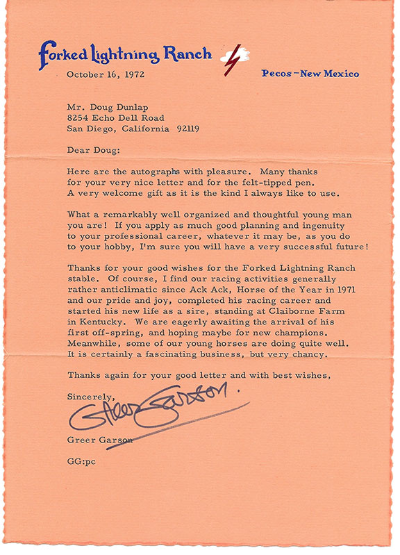 GARSON, Greer (1904-1996). British/American actress and singer. Major star with MGM. One of America’s top bx office attractions. Academy Award for Best Actress for Mrs. Miniver (1942). Married Buddy Fogelson. Fabulous, typed letter signed on her Forked Lightning Ranch stationery, Pecos-New Mexico. October 16, 1972. She writes in part: “....Thanks for your good wishes for the Forked Lightning Ranch stable. Of course, I find our racing activities generally rather anticlimactic since Ack Ack, Horse of the Year in 1971 and our pride and joy, completed his racing career and started his new life as a sire, standing at Claiborne Farm in Kentucky. We are eagerly awaiting the arrival of his first off-spring and hoping for new champions. Meanwhile, some of our young horses are doing quite well. It is certainly a fascinating business, but very chancy.....” Signed with a large, bold signature Greer Garson. In fine condition.......$150.00