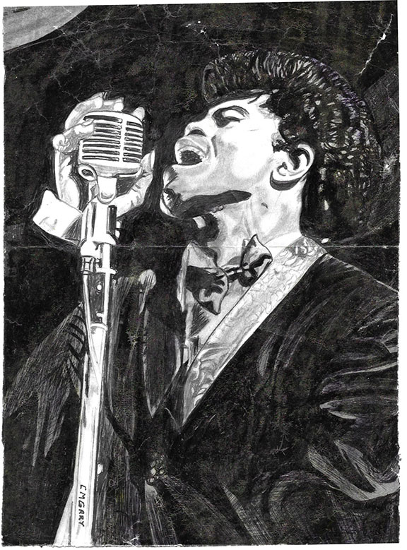 Original portrait, well executed of Little Richard. Measures 7.5”x10”. Appears to be accomplished in ink and possibly some pencil and paint. Little Richard is bellowing out into a microphone. Signed using black ink ‘’C. M. Gary’’ on the bottom of the microphone stand. Perfect for framing...........................$150.00